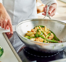 De truc van wokken of roerbakken is hoge hitte combineren met voortdurend omscheppen. Met deze Industry 5 wok met platte bodem ga je snel en goed aan de slag op elk fornuis. Zeker op een gasvuur maar ook op inductie. Waag je dus gerust aan gewokte kip met paprikareepjes, scampi in curry of noedels met rundvlees en erwtjes.