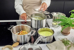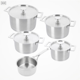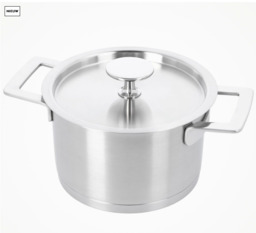 In de Lino 3 set vind je drie hoge kookpannen (16, 20 en 24 cm doorsnede) en een kookpan (20 cm), elk voorzien van een naadloos passend deksel dat schittert in zijn contrast met het matte roestvrij staal. Het steelpannetje (16 cm) maakt de kookset compleet.