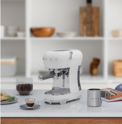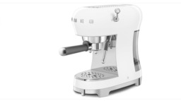 De Smeg 50's style halfautomatische espressomachine is vervaardigd uit wit kunststof en roestvrij staal en bereidt espresso uit gemalen koffiebonen en ESE-servings. De machine heeft een afmeting van 33 x 15 x 30,5 cm en heeft een waterreservoir met een inhoud van 1 liter. Naast espresso kun je, door middel van het stoompijpje, met de Smeg espressomachine ook melkschuim bereiden voor bijvoorbeeld cappuccino en caffé latte. De Smeg 50's style espressomachine is een halfautomatische espressomachine, vervaardigd uit kunststof en roestvrij staal. Zet niet alleen één of twee koppen espresso tegelijkertijd, maar maakt na het uitschenken van koffie ook gebruik van de heet water- en stoomfunctie, voor cappuccino en bijvoorbeeld caffé Americano. Voorzien van een Thermoblok verwarmingssysteem waarmee u de koffietemperatuur naar wens in kunt stellen. Druk versgemalen koffiebonen met behulp van de bijgeleverde koffie tamper aan in de piston en hang deze in de machine. De espressomachine is ook te gebruiken met ESE-servings. Vervolgens schenkt de machine heerlijke espresso. Na het uitschenken van uw espresso kunt u met de stoompijp melk opschuimen voor het bereiden van cappuccino of caffé latte. Bovenop de machine is er plaats om kopjes te bewaren en voor te verwarmen. De machine is voorzien van een automatische stand-by functie die inschakelt na 9 minuten, 30 minuten of 3 uur. Reinig de Smeg 50's style espressomachine met een vochtige doek. Reinig de lekbak en het schuim hulpstuk met warm water en afwasmiddel.